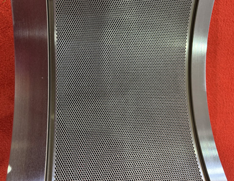 材料选用特约钢厂冶炼的专用环模材料46Cr13,含Cr量在13.5%以上,其防腐蚀磨损能力是普通4Cr13的1.5倍以上。机加工后采用枪钻钻孔,工效高,生产周期短,光洁度高,出料顺畅。热处理采用真空炉加热,控制硬度好,且经过三次回火,保环模内部组织稳定不易变形。