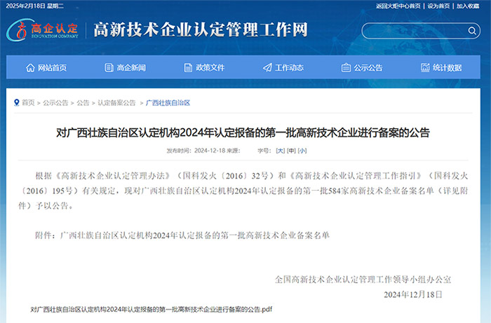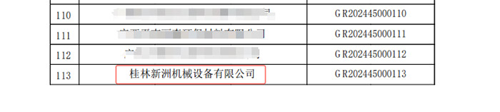 2024年12月18日,全国高新技术企业认定管理工作领导小组办公室根据《高新技术企业认定管理办法》(国科发火〔2016〕32号)和《高新技术企业认定管理工作指引》(国科发火〔2016〕195号)有关规定, 发布了《对广西壮族自治区认定机构2024年认定报备的第一批高新技术企业进行备案的公告》,桂林新洲机械设备有限公司顺利通过“国家高新技术企业”认定,由此正式迈入国家高新技术企业行列,开启新篇章。